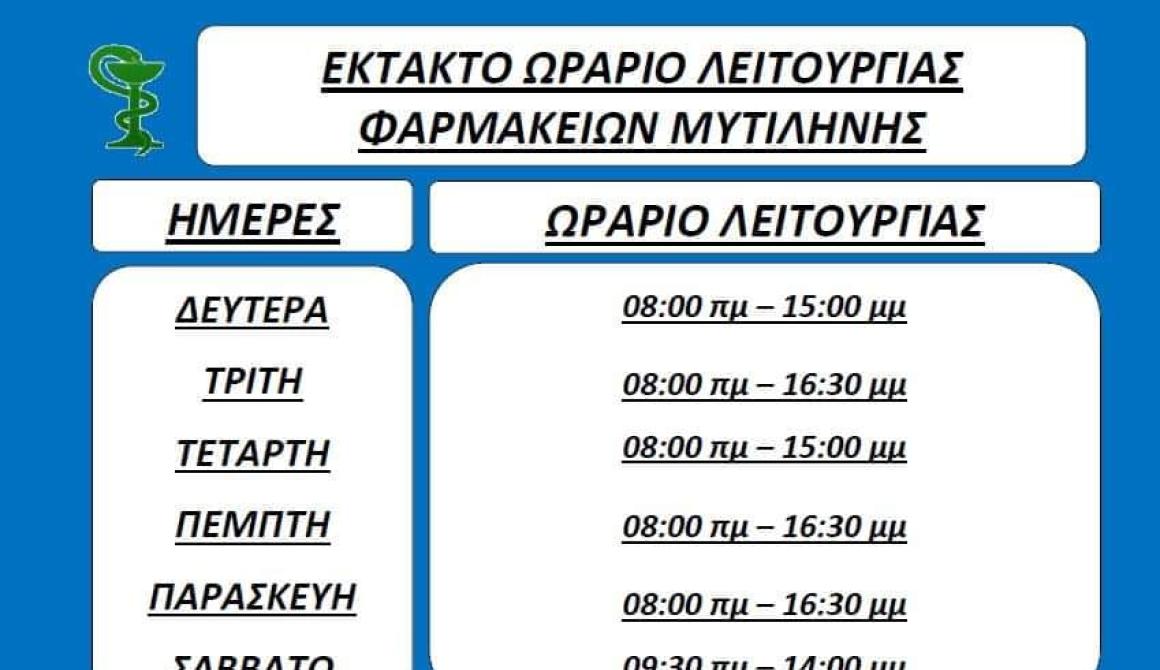 Για την πόλη της Μυτιλήνης το ωράριο διαμορφώνεται ως εξής: