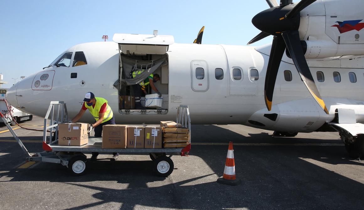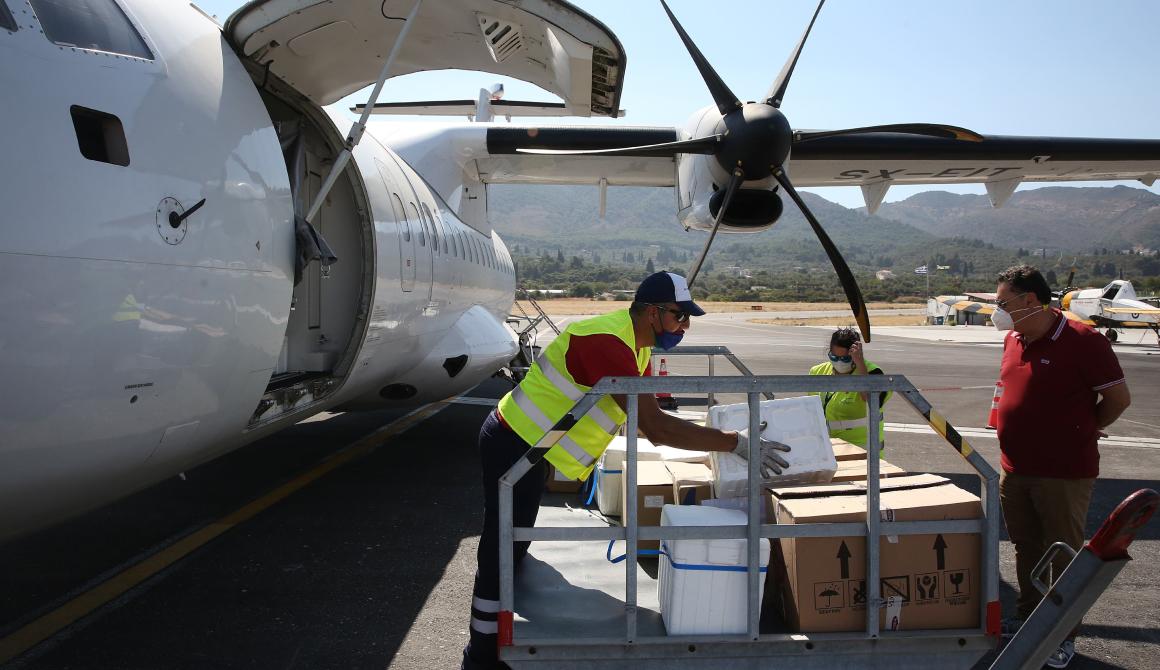 Εργαζόμενοι του αεροδρομίου μεταφέρουν υγειονομικό υλικό για τη Μόρια, από αεροπλάνο που έφτασε στη Μυτιλήνη,