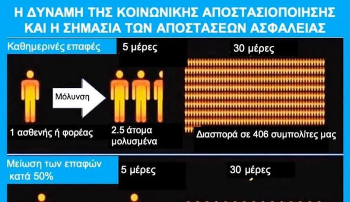 Η πρώτη στήλη, που φορά τις καθημερινές επαφές δείχνει ότι ένας ασθενής ή φορέας μπορεί να μολύνει σε 5 ημέρες 2,5 άτομα και με τη διασπορά σε 30 μέρες να φτάνει σε 406 συμπολίτες μας.