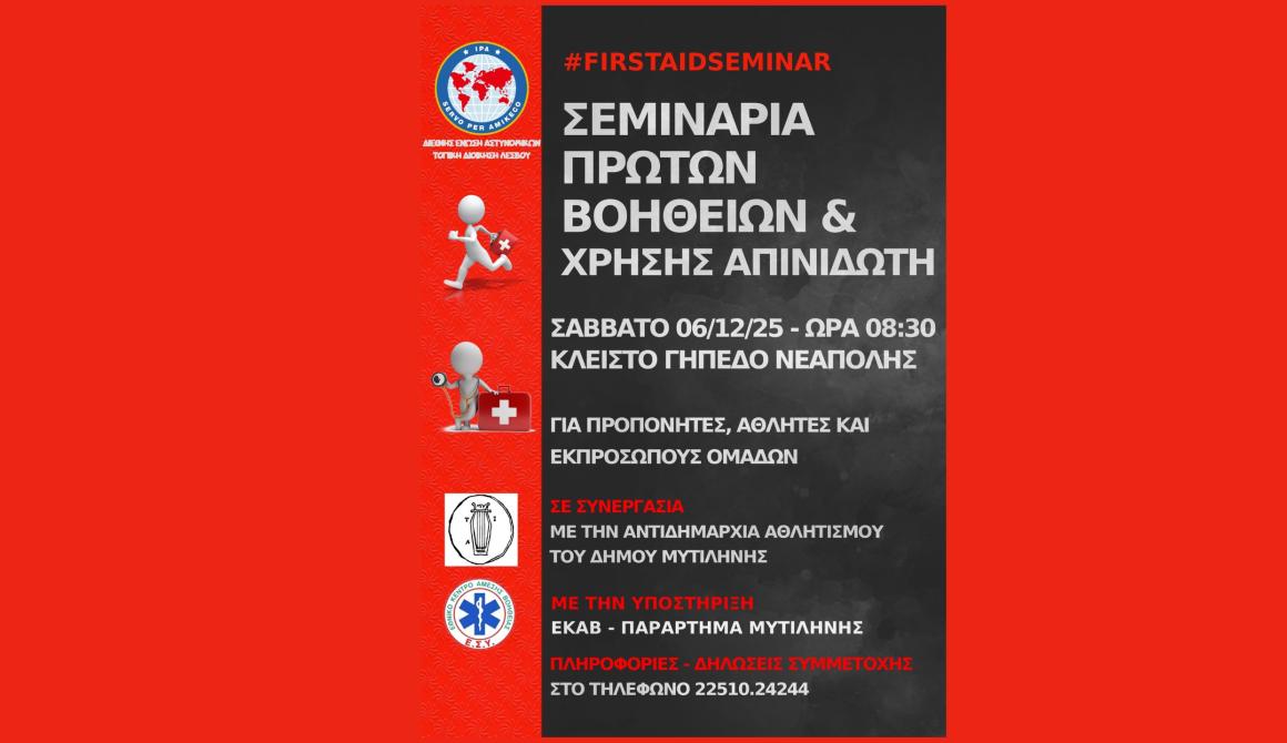 Μυτιλήνη: Σεμινάρια Πρώτων Βοηθειών & Χρήσης Απινιδωτή για προπονητές και αθλητές – Το Σάββατο στη Νεάπολη