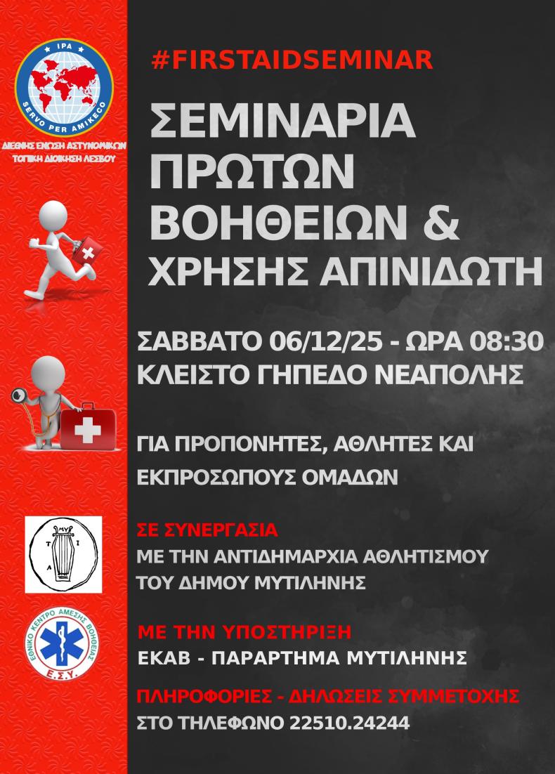 Στον σφυγμό της πρόληψης και της πραγματικής ευθύνης για τον αθλητισμό, η Τοπική Διοίκηση Λέσβου της Διεθνούς Ένωσης Αστυνομικών ενώνει δυνάμεις με την Αντιδημαρχία Αθλητισμού του Δήμου Μυτιλήνης και το Παράρτημα Μυτιλήνης του ΕΚΑΒ, διοργανώνοντας ένα κρίσιμο και απολύτως αναγκαίο σεμινάριο: πρώτες βοήθειες και χρήση απινιδωτή, το Σάββατο 6 Δεκεμβρίου στο Κλειστό Γυμναστήριο Νεάπολης.