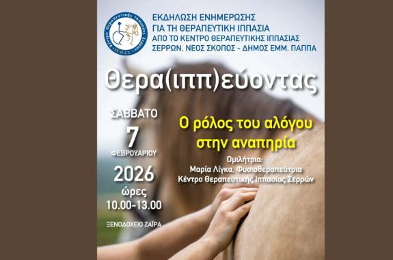 Ο Σύνδεσμος Κοινωνικής Προστασίας & Αλληλεγγύης Δήμων Μυτιλήνης και Δυτικής Λέσβου έχει την τιμή να σας προσκαλέσει σε ενημερωτική εκδήλωση με θέμα τη θεραπευτική ιππασία και τον ρόλο της στην υποστήριξη ατόμων με αναπηρία. Η εκδήλωση θα πραγματοποιηθεί το Σάββατο 7 Φεβρουαρίου και ώρα 10:00 π.μ...