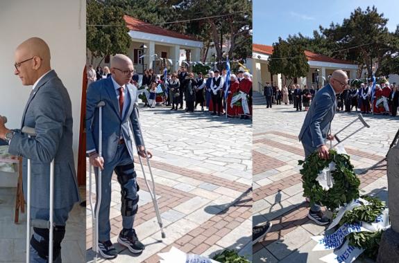 Συγκλονιστική στιγμή στον Άη Στράτη: Ο Δήμαρχος εμφανίστηκε στην παρέλαση μετά το χειρουργείο, στέλνοντας μήνυμα δύναμης και ελπίδας.