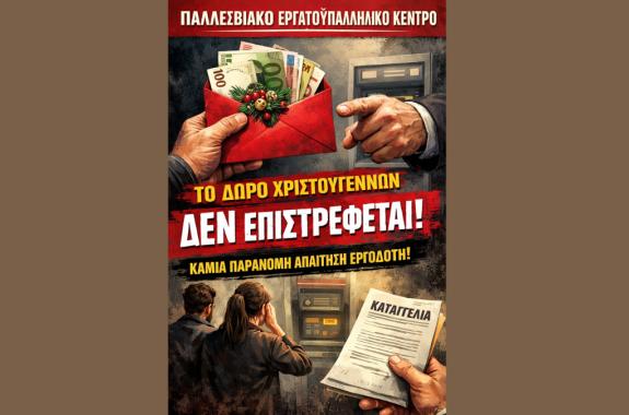 Ξεκάθαρη παρέμβαση του Παλλεσβιακού Εργατοϋπαλληλικού Κέντρου: το Δώρο Χριστουγέννων είναι δικαίωμα, δεν επιστρέφεται και κάθε απαίτηση εργοδότη είναι παράνομη. Καταγγελίες και οδηγίες για τους εργαζόμενους στη Λέσβο.
